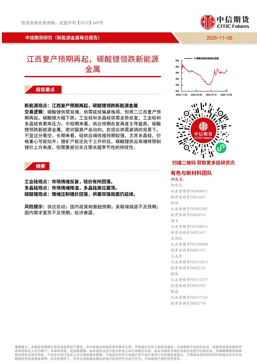 研报:中信期货-新能源金属每日报告:江西复产预期再起,碳酸锂领跌新能源金属-251105