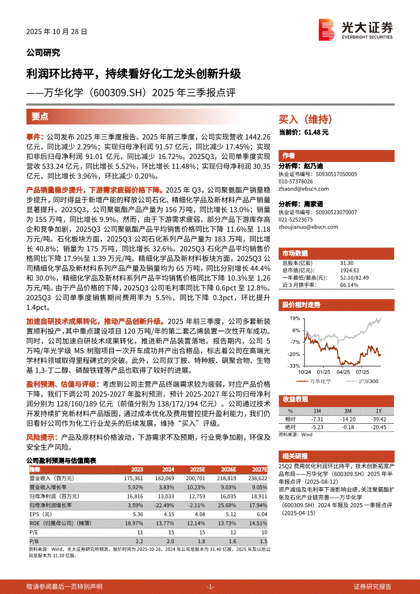 万华化学研报:光大证券-万华化学-600309-2025年三季报点评:利润环比持平,持续看好化工龙头创新升级-251028