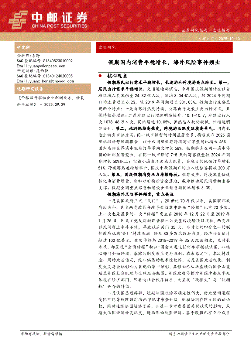 研报:中邮证券-宏观研究:假期国内消费平稳增长,海外风险事件频出-251010