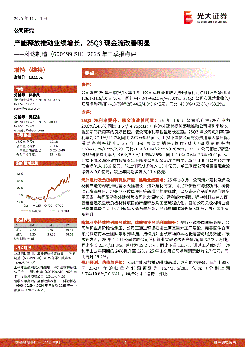 科达制造研报:光大证券-科达制造-600499-2025年三季报点评:产能释放推动业绩增长,25Q3现金流改善明显-251101