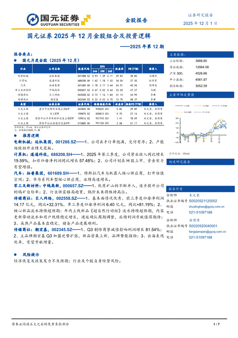 研报:国元证券-2025年第12期:国元证券2025年12月金股组合及投资逻辑-251201