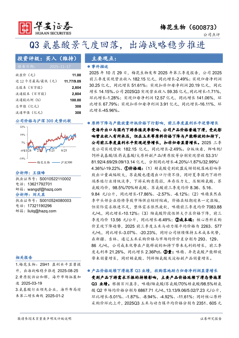 梅花生物研报:华安证券-梅花生物-600873-Q3氨基酸景气度回落,出海战略稳步推进-251117