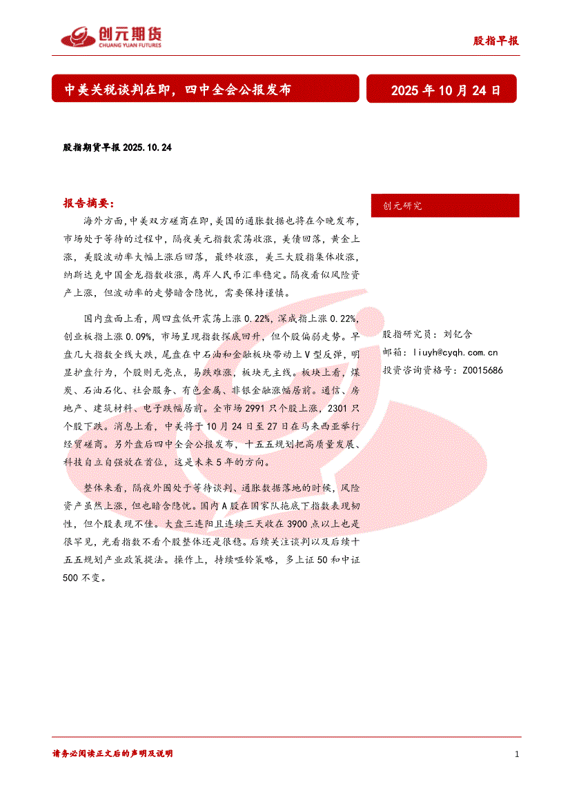 研报:创元期货-股指期货早报:中美关税谈判在即,四中全会公报发布-251024