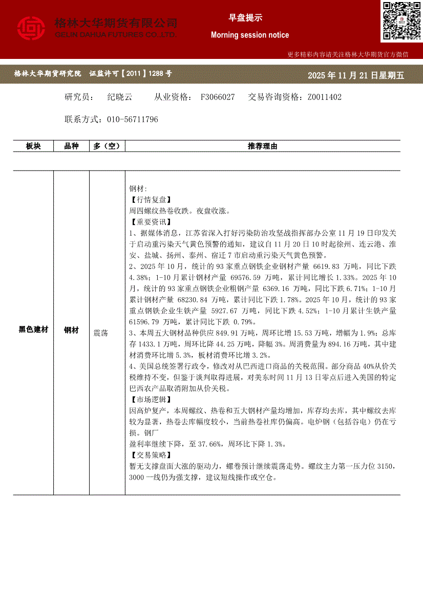 南华期货-钢材产业周报:成材震荡,底部支撑-251116