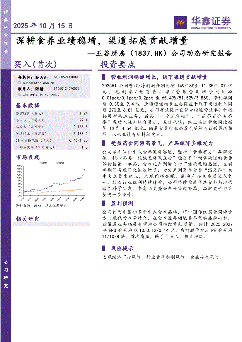五谷磨房研报:华鑫证券-五谷磨房-1837.HK-公司动态研究报告:深耕食养业绩稳增,渠道拓展贡献增量-251015