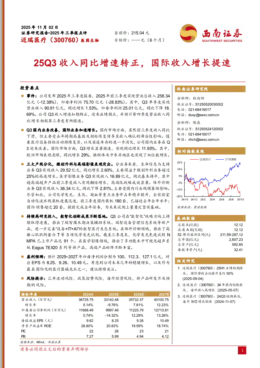 迈瑞医疗研报:西南证券-迈瑞医疗-300760-25Q3收入同比增速转正,国际收入增长提速-251102
