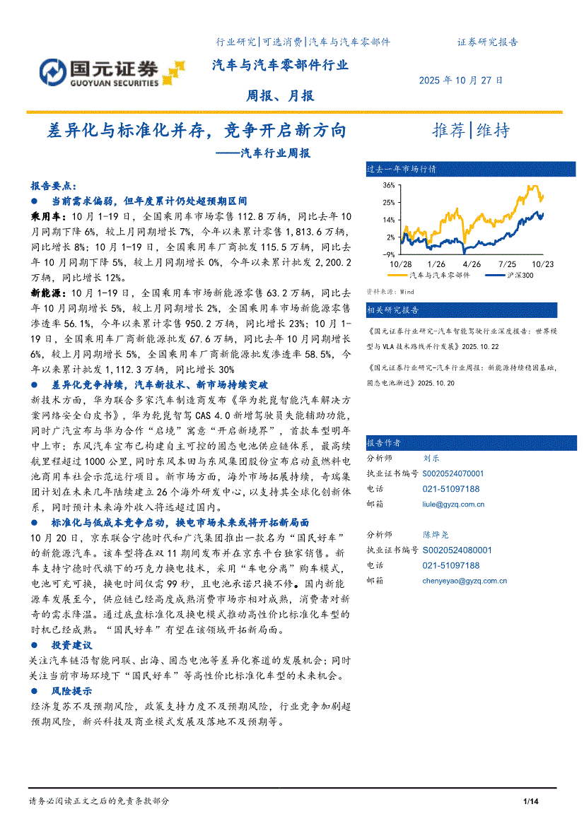 汽车行业研报:国元证券-汽车行业周报:差异化与标准化并存,竞争开启新方向-251027