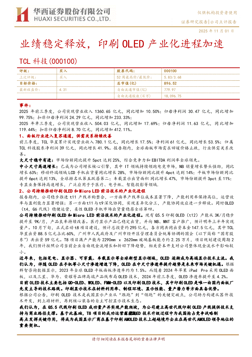 TCL科技研报:华西证券-TCL科技-000100-业绩稳定释放,印刷OLED产业化进程加速-251101
