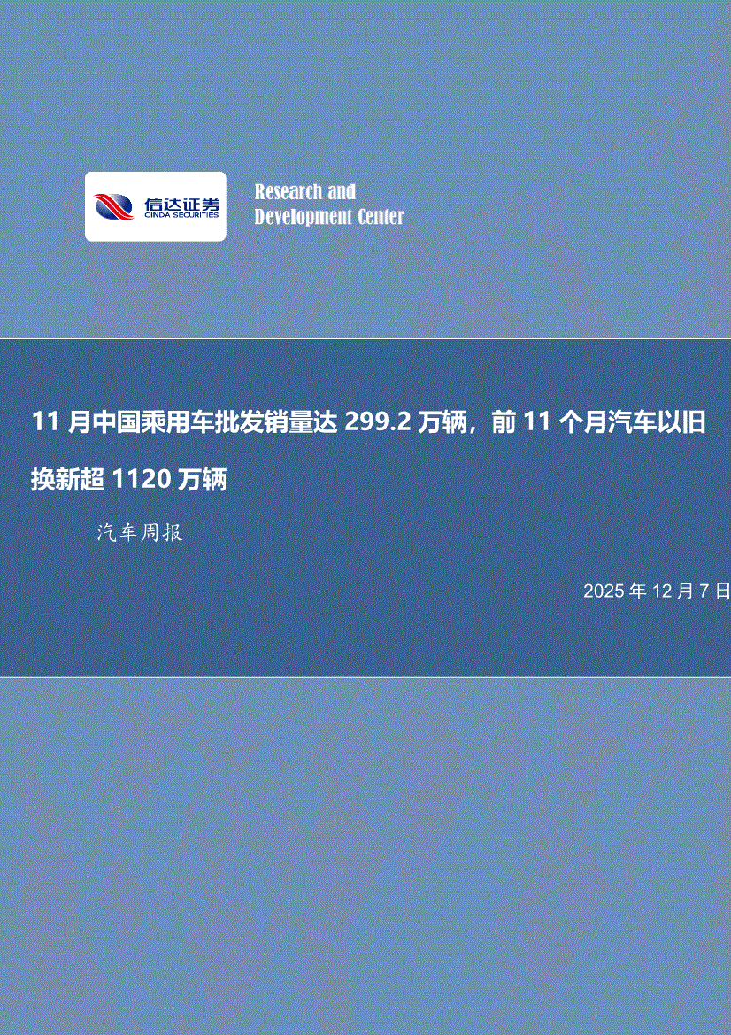 汽车行业研报:信达证券-汽车行业周报:11月中国乘用车批发销量达299.2万辆,前11个月汽车以旧换新超1120万辆-251207