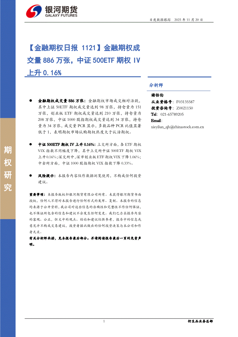 研报:银河期货-【金融期权日报1121】金融期权成交量886万张,中证500ETF期权IV上升0.16%-251121