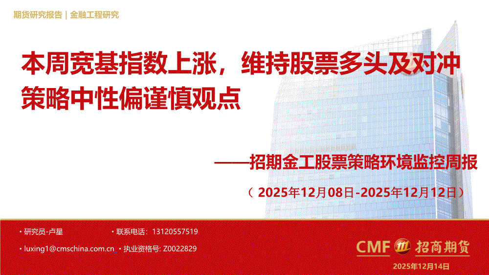 研报:招商期货-招期金工股票策略环境监控周报:本周宽基指数上涨,维持股票多头及对冲策略中性偏谨慎观点-251214