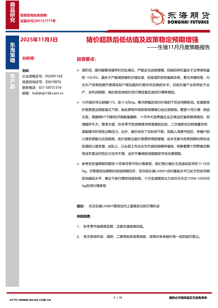 研报:东海期货-生猪11月月度策略报告:猪价超跌后低估值及政策稳定预期增强-251103