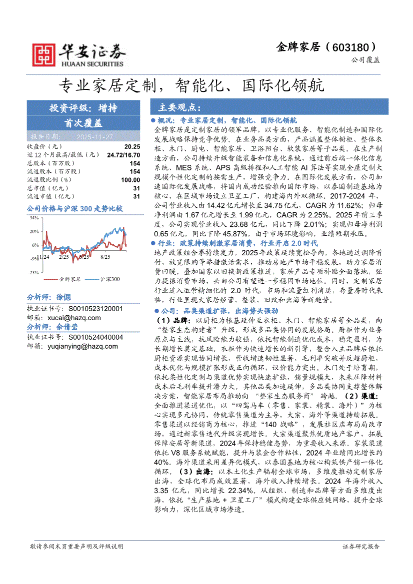 金牌家居研报:华安证券-金牌家居-603180-专业家居定制,智能化、国际化领航-251127