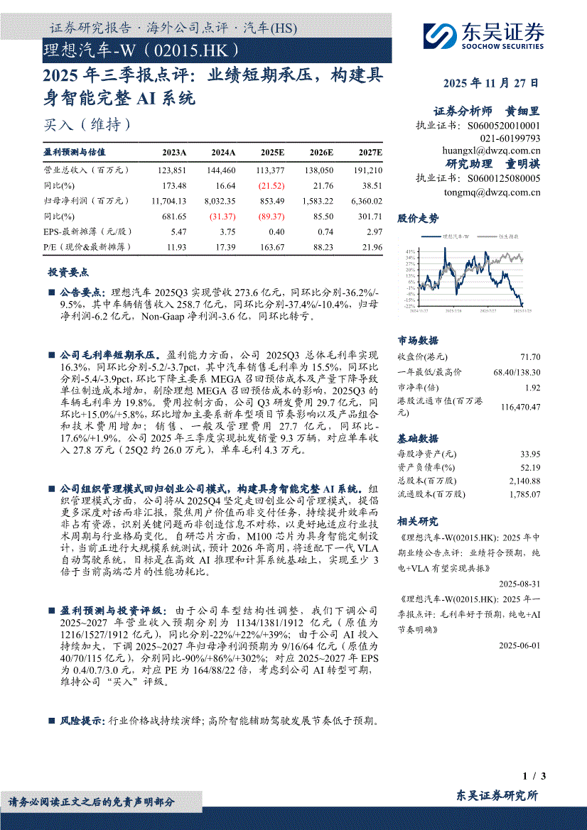 理想汽车~W研报:金宝搏官网188金宝搏-理想汽车~W-2015.HK-2025年三季报点评:业绩短期承压,构建具身智能完整AI系统-251127