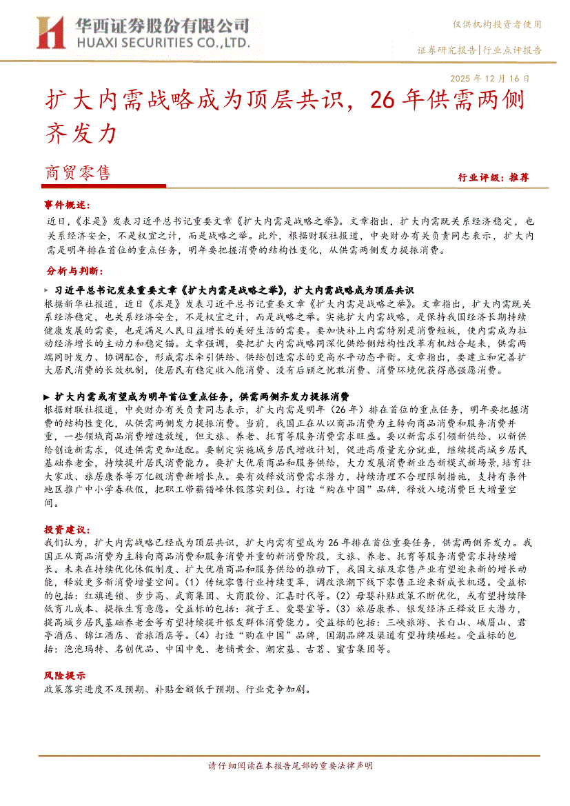 商贸零售行业研报:华西证券-商贸零售行业:扩大内需战略成为顶层共识,26年供需两侧齐发力-251216