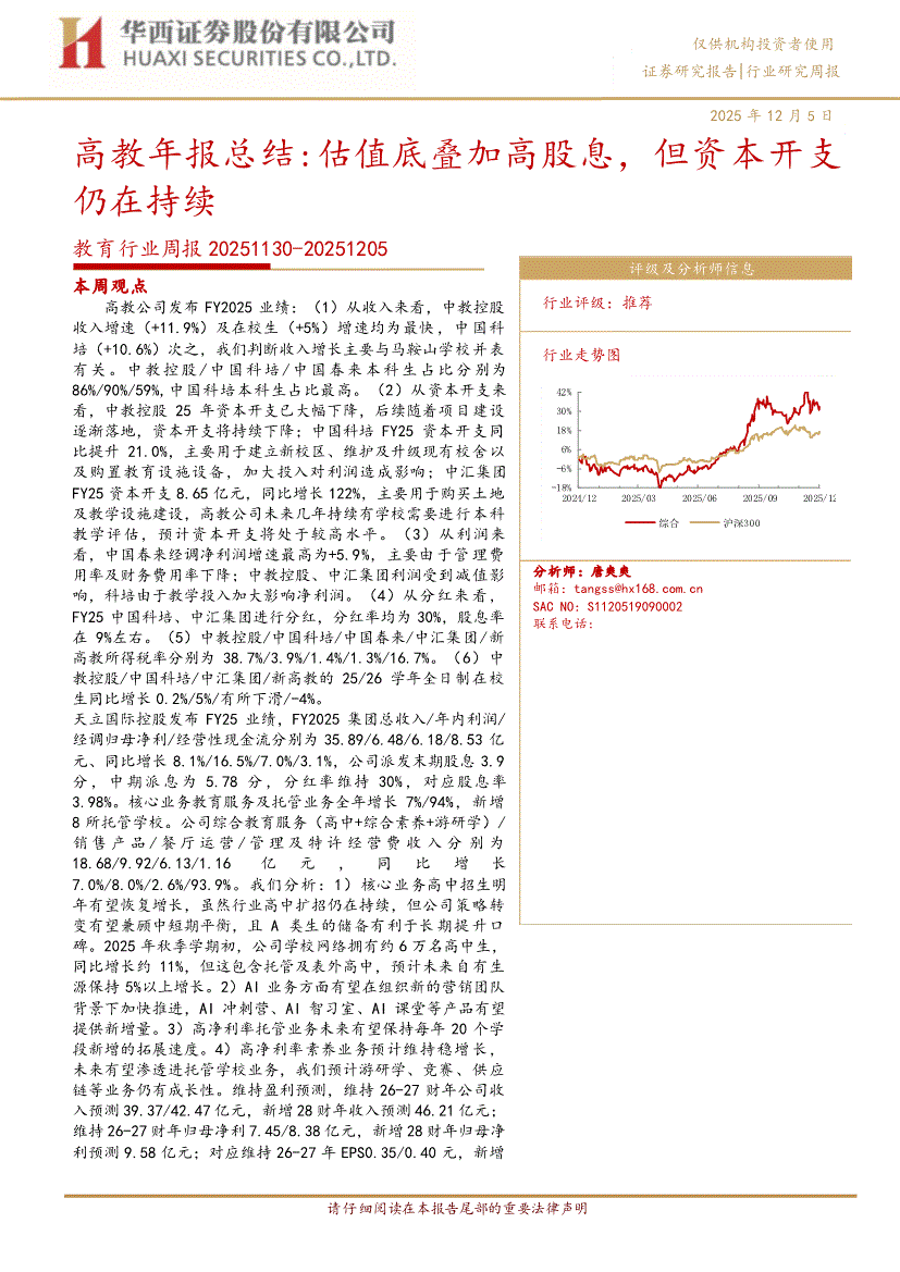 教育行业研报:华西证券-教育行业周报:高教年报总结,估值底叠加高股息,但资本开支仍在持续-251205