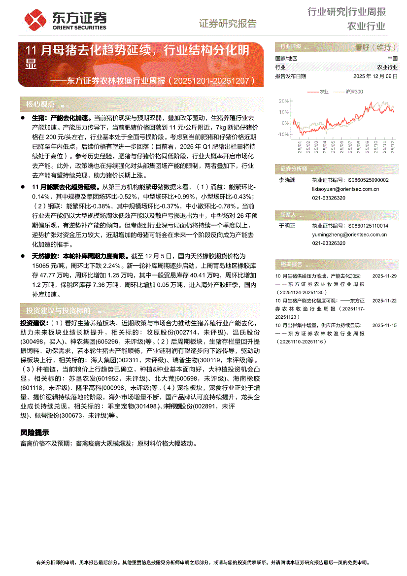 农林牧渔行业研报:东方证券-农林牧渔行业周报:11月母猪去化趋势延续,行业结构分化明显-251206