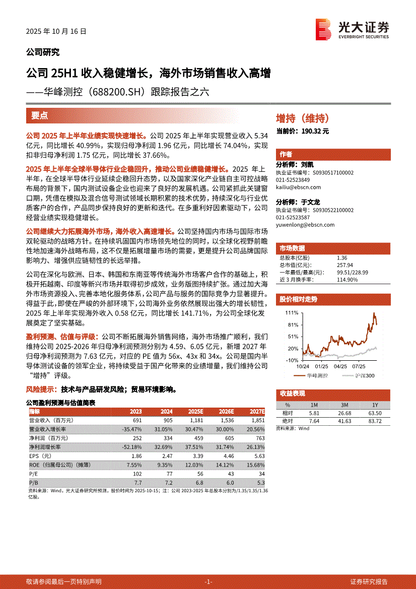华峰测控研报:光大证券-华峰测控-688200-跟踪报告之六:公司25H1收入稳健增长,海外市场销售收入高增-251016