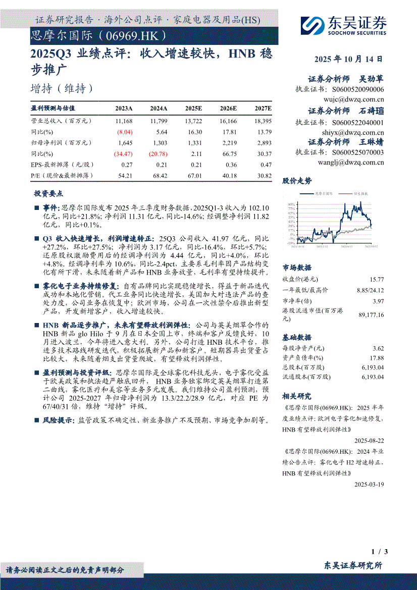 思摩尔国际研报:金宝搏官网188金宝搏-思摩尔国际-6969.HK-2025Q3业绩点评:收入增速较快,HNB稳步推广-251014