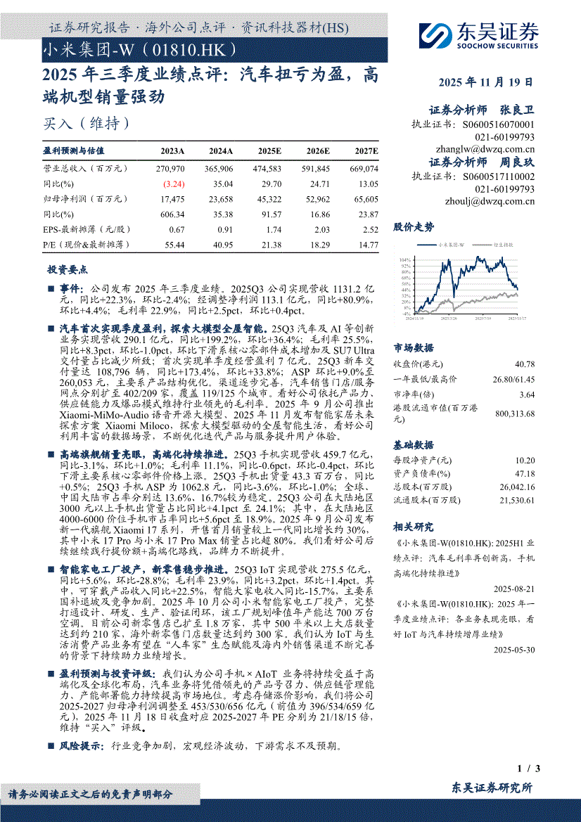 小米集团~W研报:金宝搏官网188金宝搏-小米集团~W-1810.HK-2025年三季度业绩点评:汽车扭亏为盈,高端机型销量强劲-251119