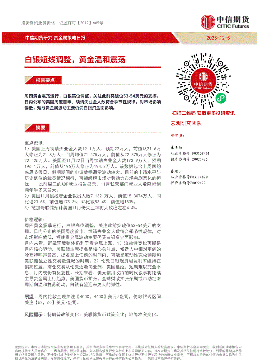 研报:中信期货-贵金属策略日报:白银短线调整,黄金温和震荡-251205