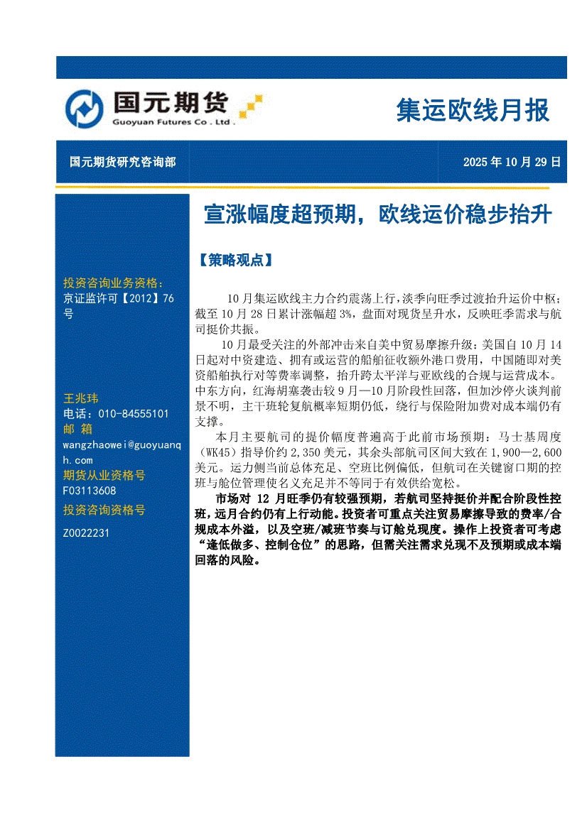 研报:国元期货-集运欧线月报:宣涨幅度超预期,欧线运价稳步抬升-251029