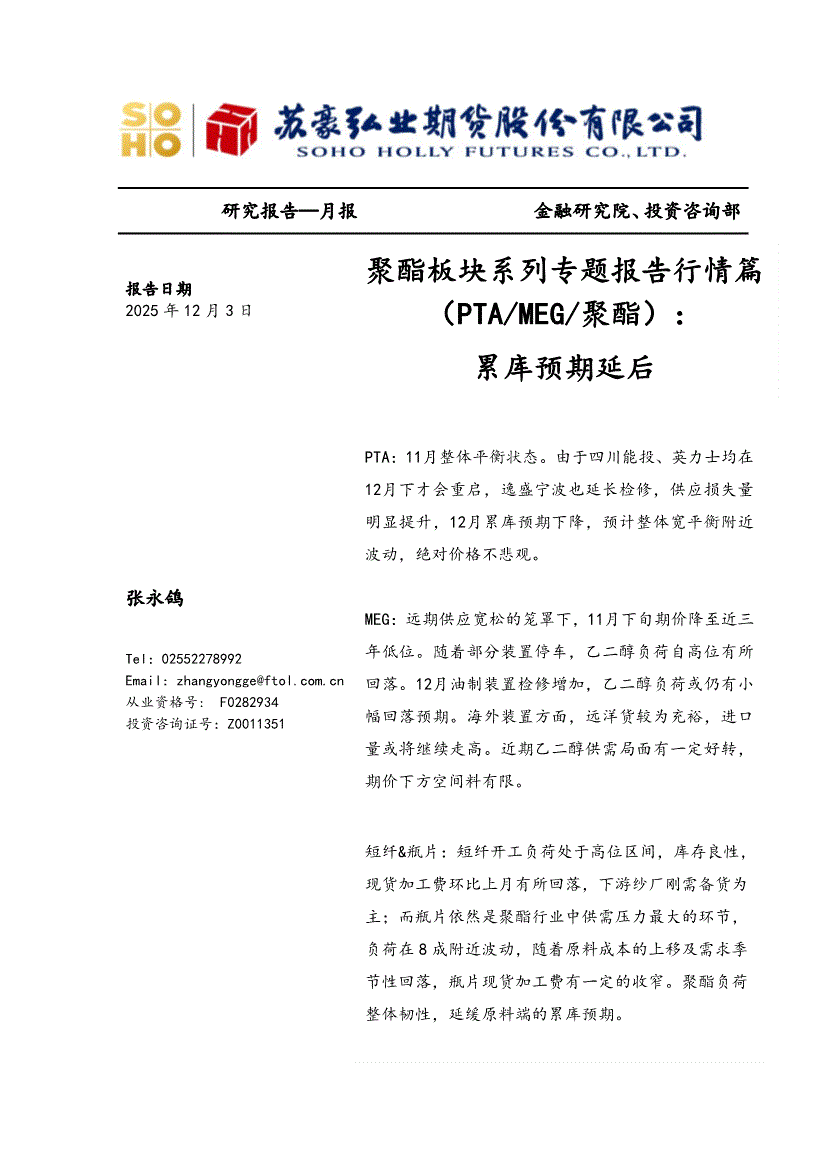 研报:弘业期货-聚酯板块系列专题报告行情篇(PTA/MEG/聚酯):累库预期延后-251203