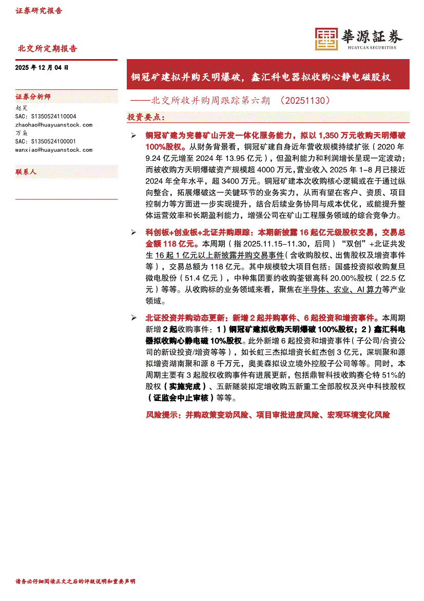 研报:华源证券-北交所收并购周跟踪第六期:铜冠矿建拟并购天明爆破,鑫汇科电器拟收购心静电磁股权-251204