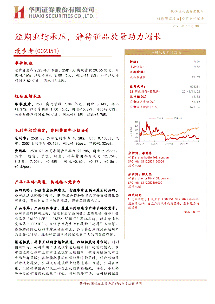 漫步者研报:华西证券-漫步者-002351-短期业绩承压,静待新品放量助力增长-251030