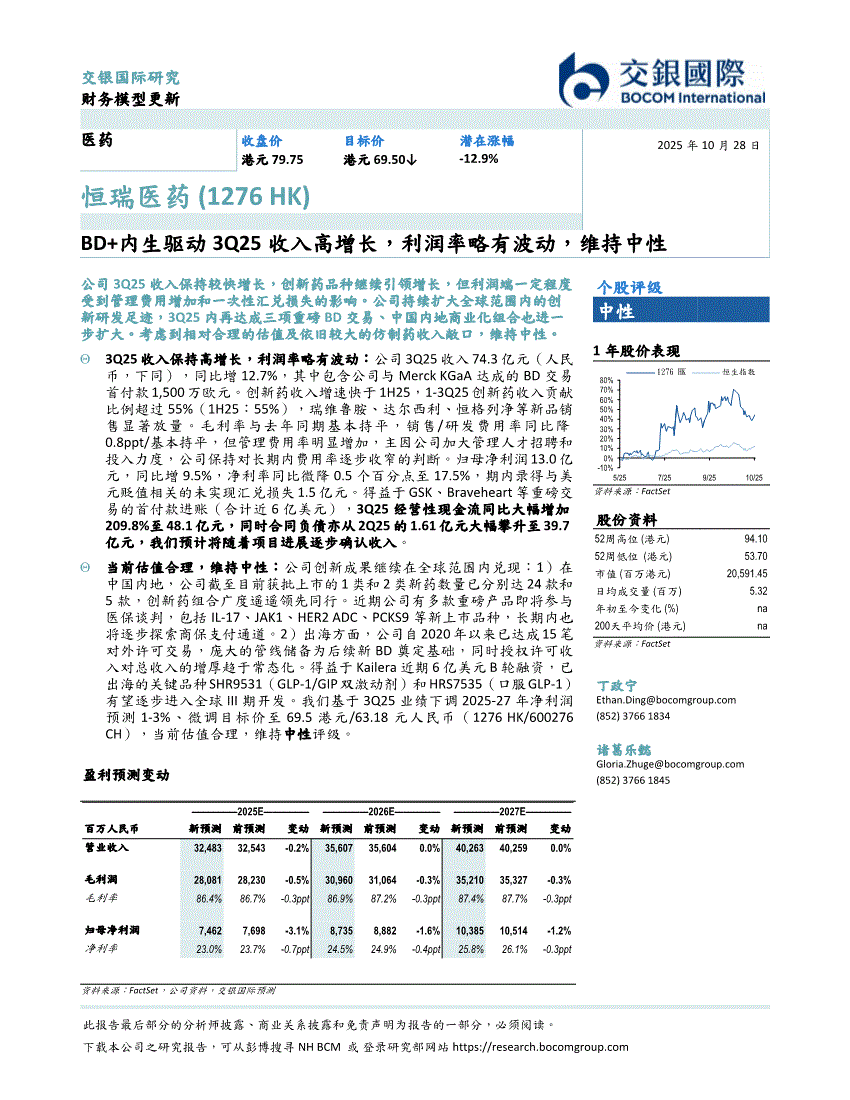 恒瑞医药研报:交银国际-恒瑞医药-1276.HK-BD+内生驱动3Q25收入高增长,利润率略有波动,维持中性-251028