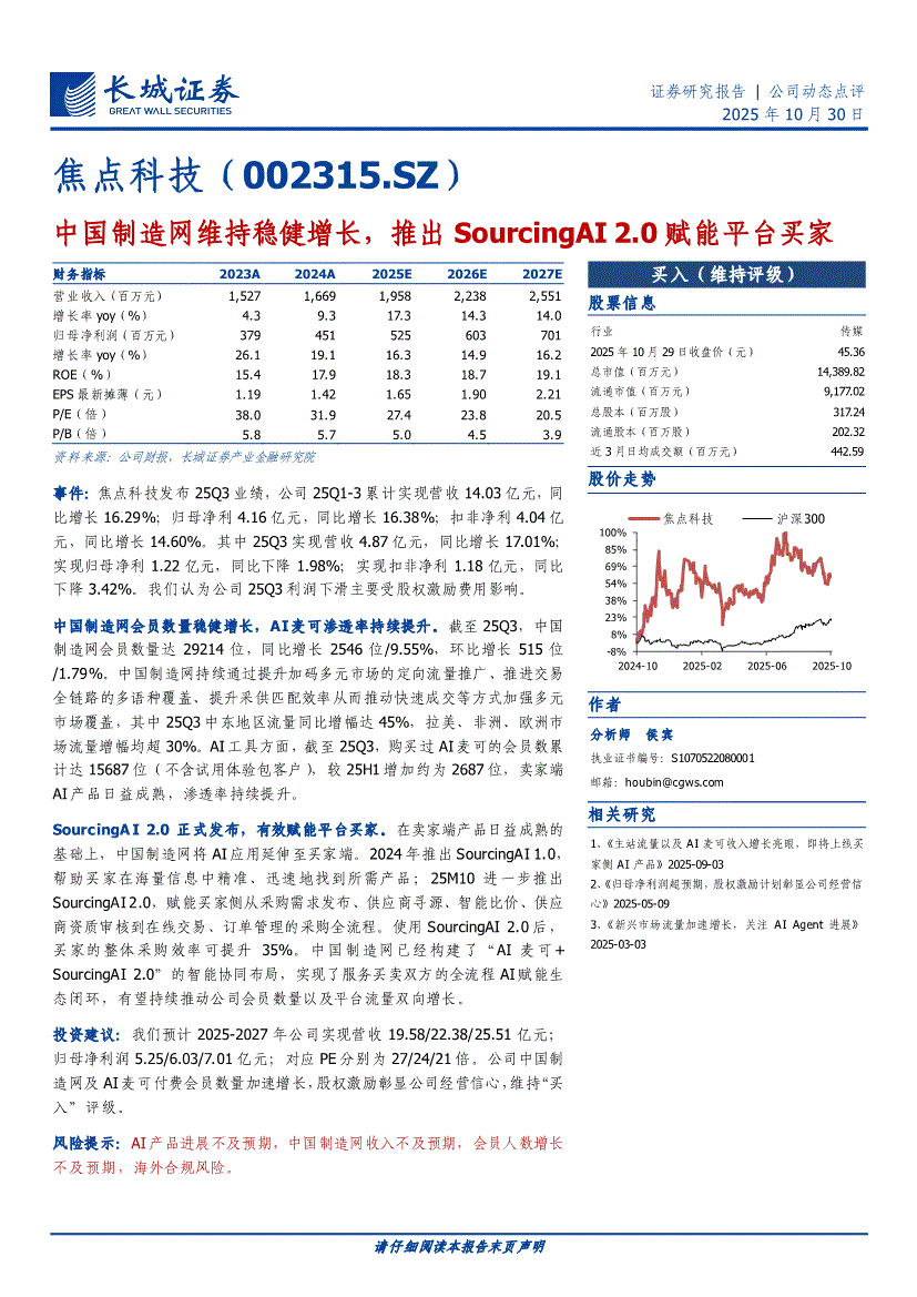 焦点科技研报:长城证券-焦点科技-002315-中国制造网维持稳健增长,推出SourcingAI 2.0赋能平台买家-251030