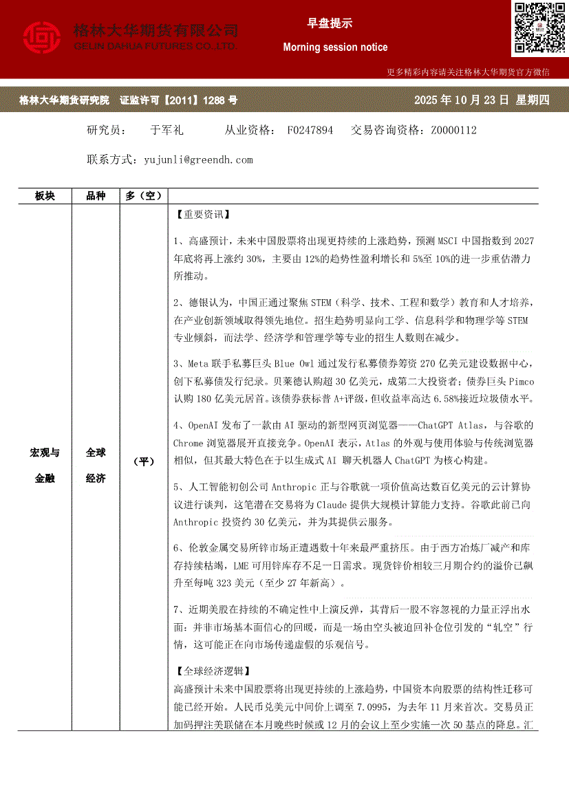 格林大华期货-全球经济早盘提示-251023