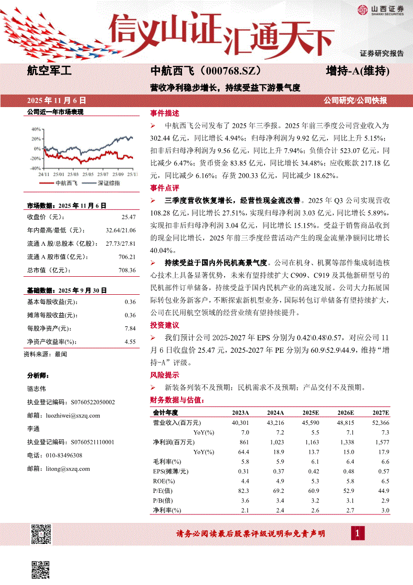 中航西飞研报:山西证券-中航西飞-000768-营收净利稳步增长,持续受益下游景气度-251106