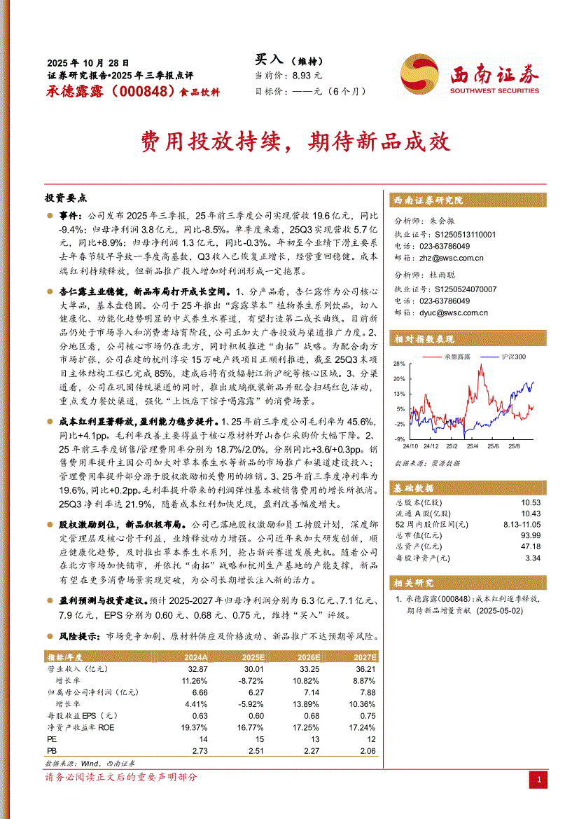 承德露露研报:西南证券-承德露露-000848-费用投放持续,期待新品成效-251028