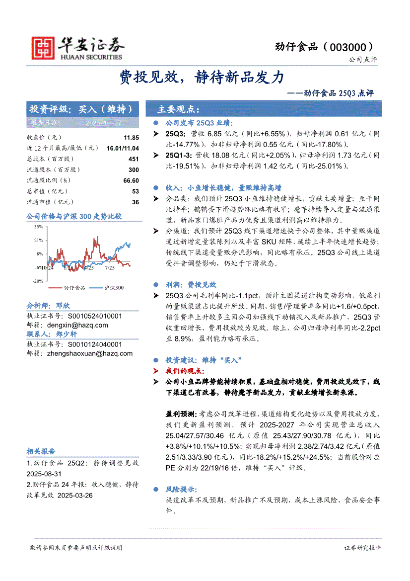 劲仔食品研报:华安证券-劲仔食品-003000-25Q3点评:费投见效,静待新品发力-251027