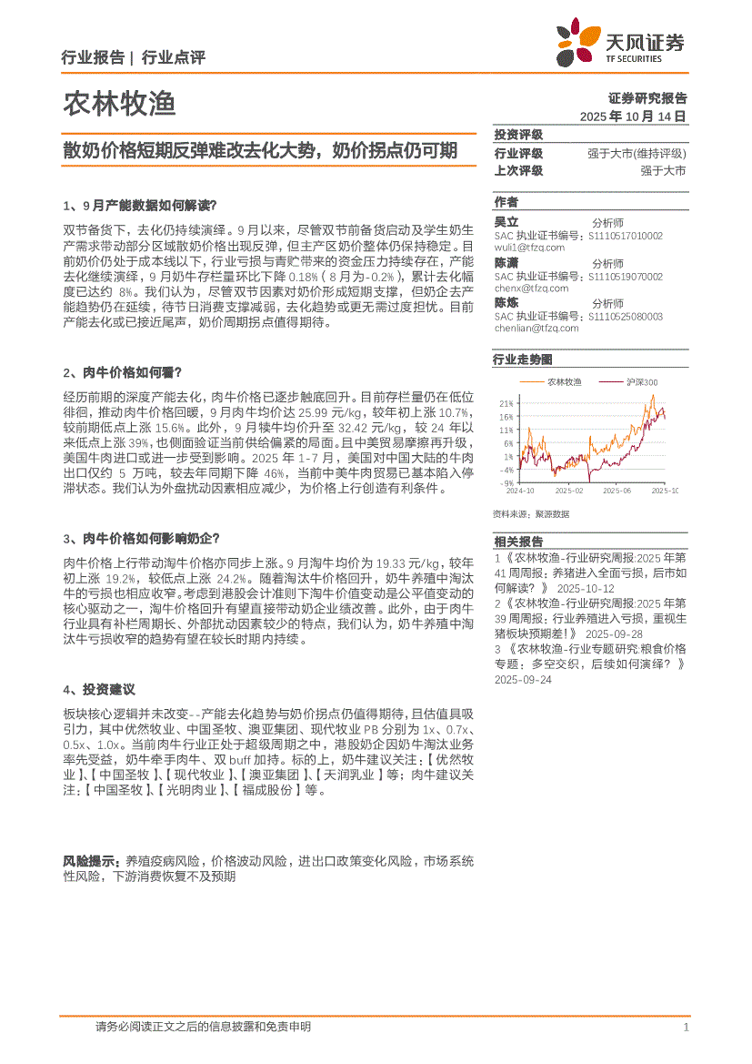 农林牧渔行业研报:天风证券-农林牧渔行业点评:散奶价格短期反弹难改去化大势,奶价拐点仍可期-251014