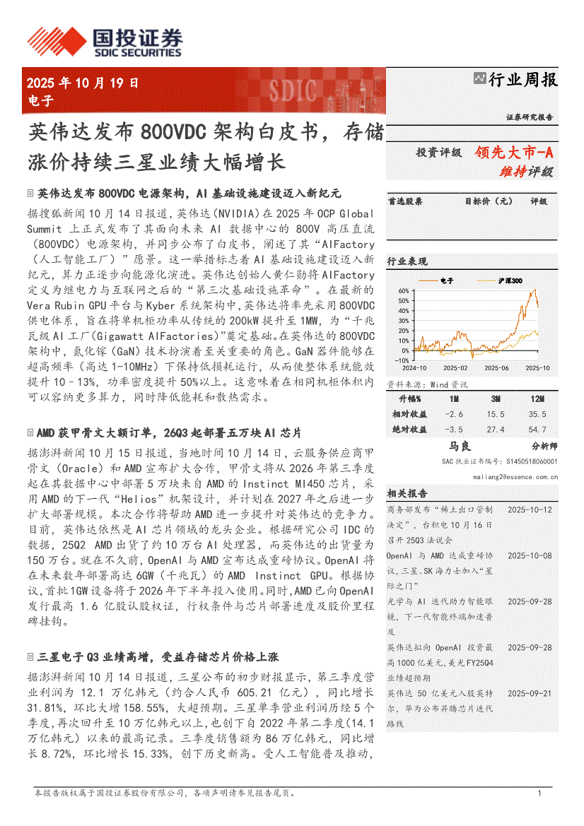 电子行业研报:国投证券-电子行业周报:英伟达发布800VDC架构白皮书,存储涨价持续三星业绩大幅增长-251019