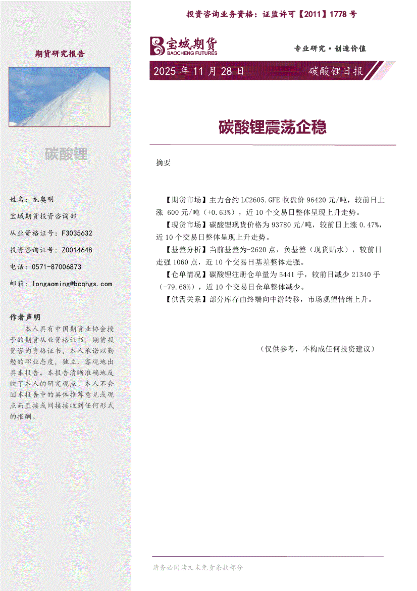 研报:宝城期货-碳酸锂日报:碳酸锂震荡企稳-251128