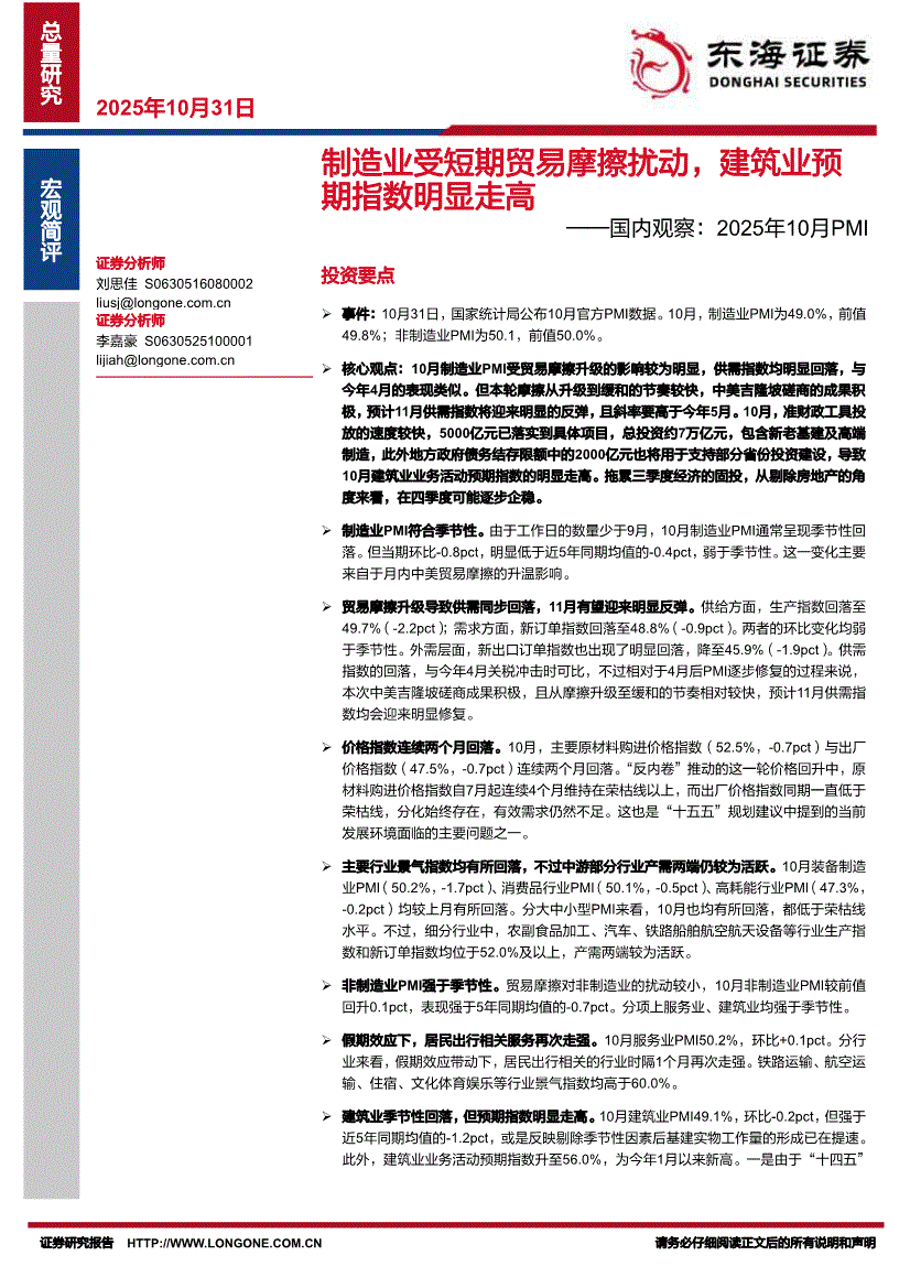 研报:东海证券-制造业受短期贸易摩擦扰动,建筑业预期指数明显走高——国内观察:2025年10月PMI-251031