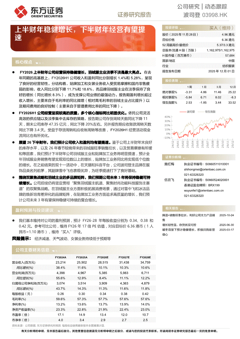 波司登研报:东方证券-波司登-3998.HK-上半财年稳健增长,下半财年经营有望提速-251201