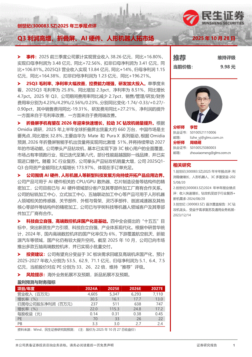 创世纪研报:民生证券-创世纪-300083-2025年三季报点评:Q3利润高增,折叠屏、AI硬件、人形机器人拓市场-251028