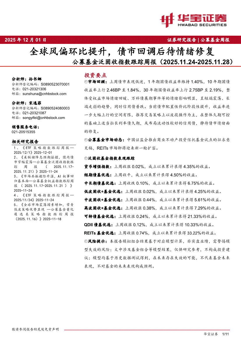 研报:华宝证券-公募基金泛固收指数跟踪周报:全球风偏环比提升,债市回调后待情绪修复-251201
