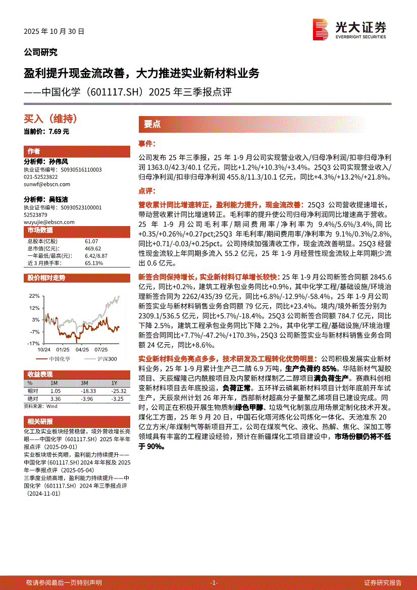 中国化学研报:光大证券-中国化学-601117-2025年三季报点评:盈利提升现金流改善,大力推进实业新材料业务-251030