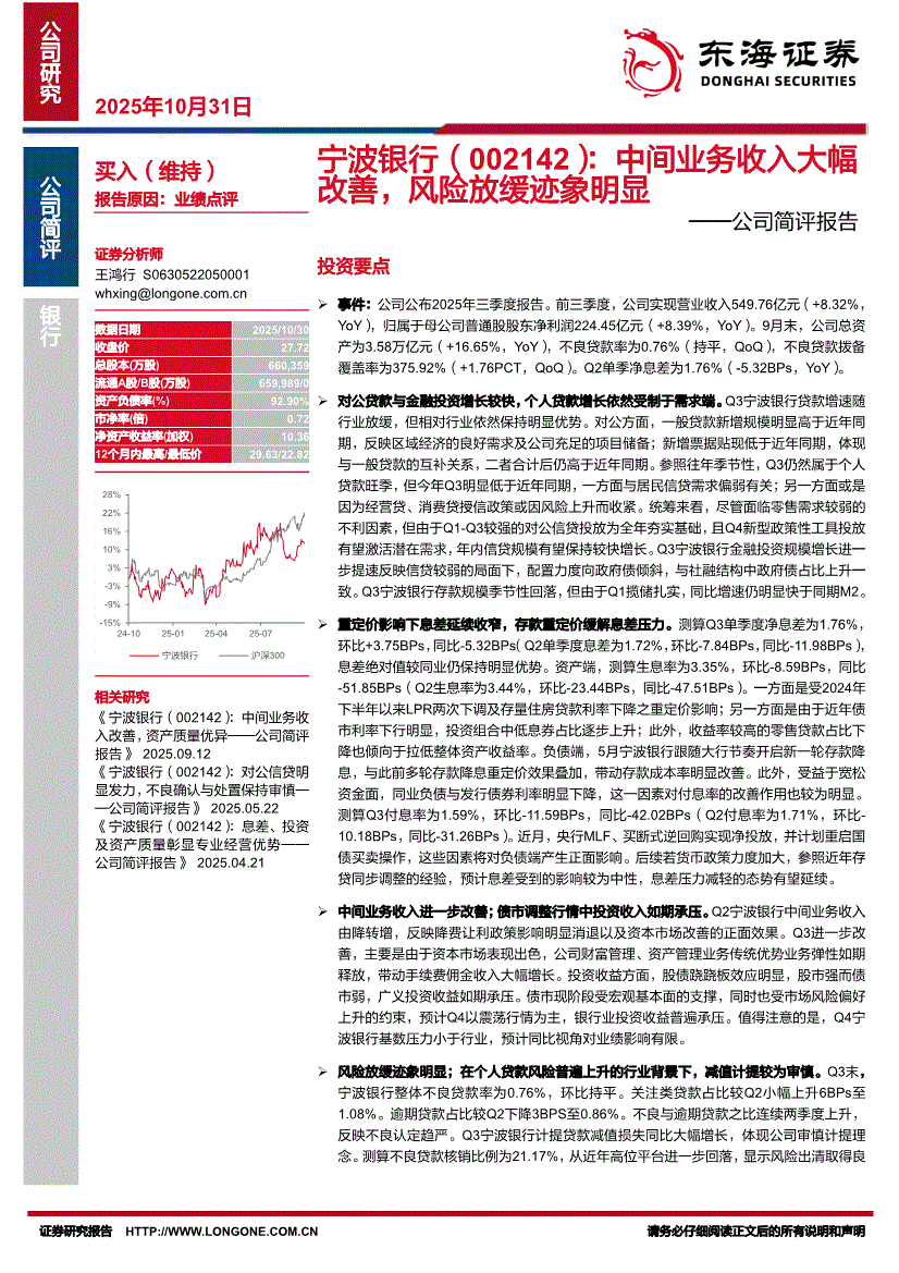宁波银行研报:东海证券-宁波银行-002142-公司简评报告:中间业务收入大幅改善,风险放缓迹象明显-251031