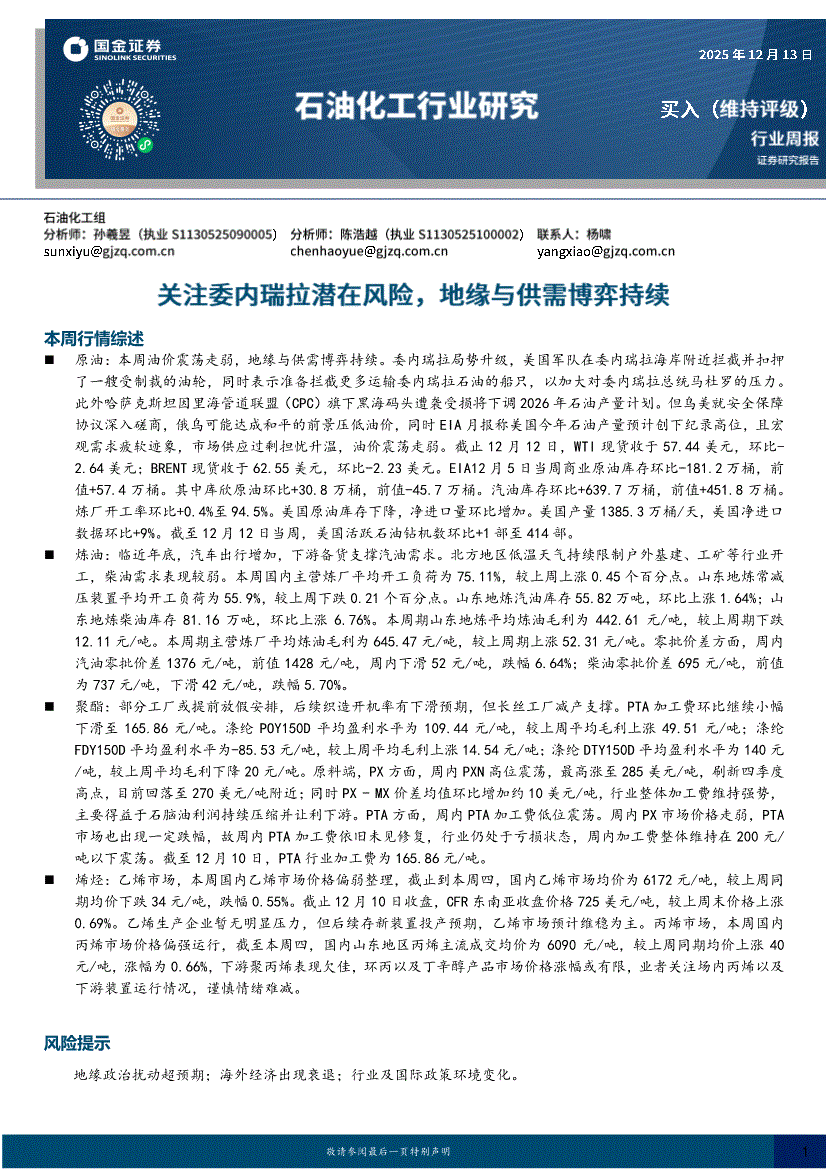 石油化工行业研报:国金证券-石油化工行业研究周报:关注委内瑞拉潜在风险,地缘与供需博弈持续-251213