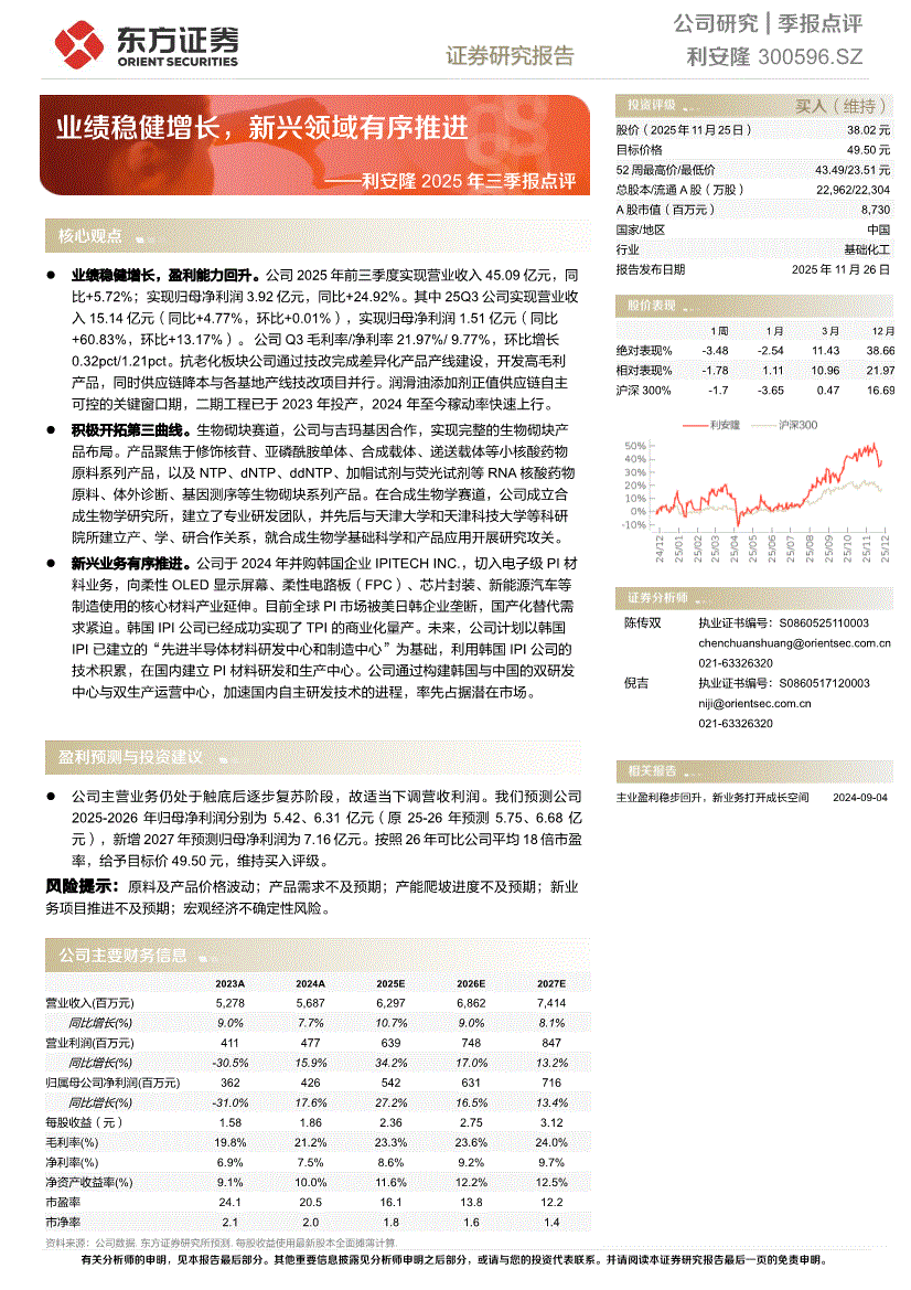 利安隆研报:东方证券-利安隆-300596-2025年三季报点评:业绩稳健增长,新兴领域有序推进-251126