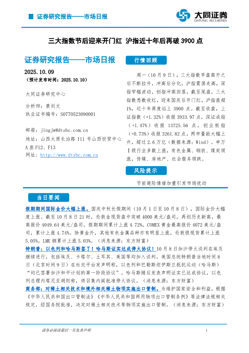 研报:大同证券-市场日报:三大指数节后迎来开门红,沪指近十年后再破3900点-251009