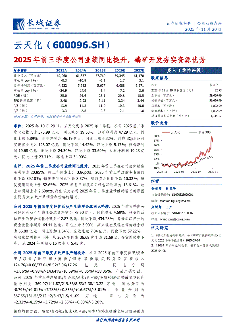 云天化研报:长城证券-云天化-600096-2025年前三季度公司业绩同比提升,磷矿开发夯实资源优势-251120