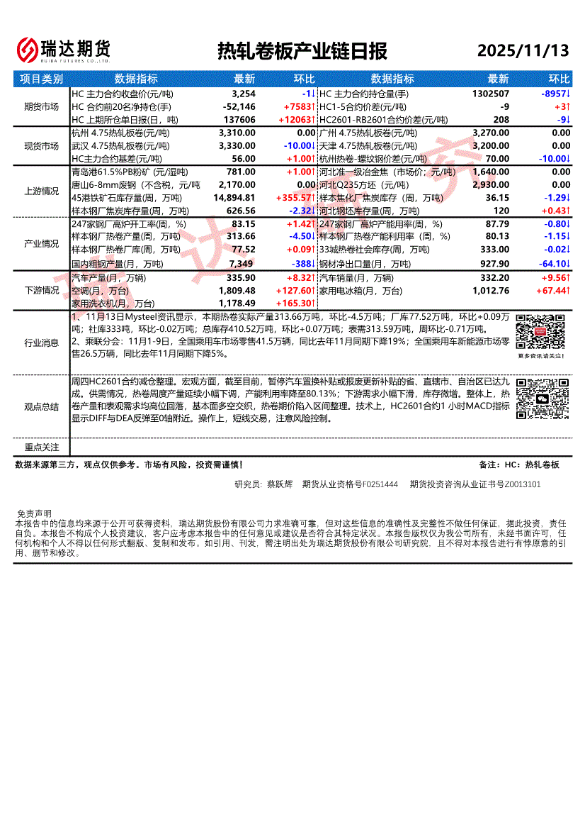 研报:瑞达期货-热轧卷板产业链日报-251113
