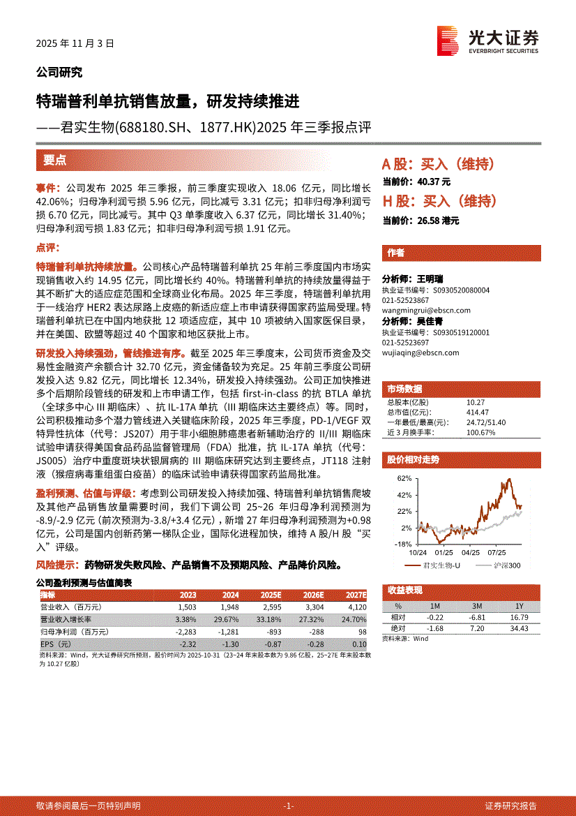 君实生物研报:光大证券-君实生物-688180-2025年三季报点评:特瑞普利单抗销售放量,研发持续推进-251103